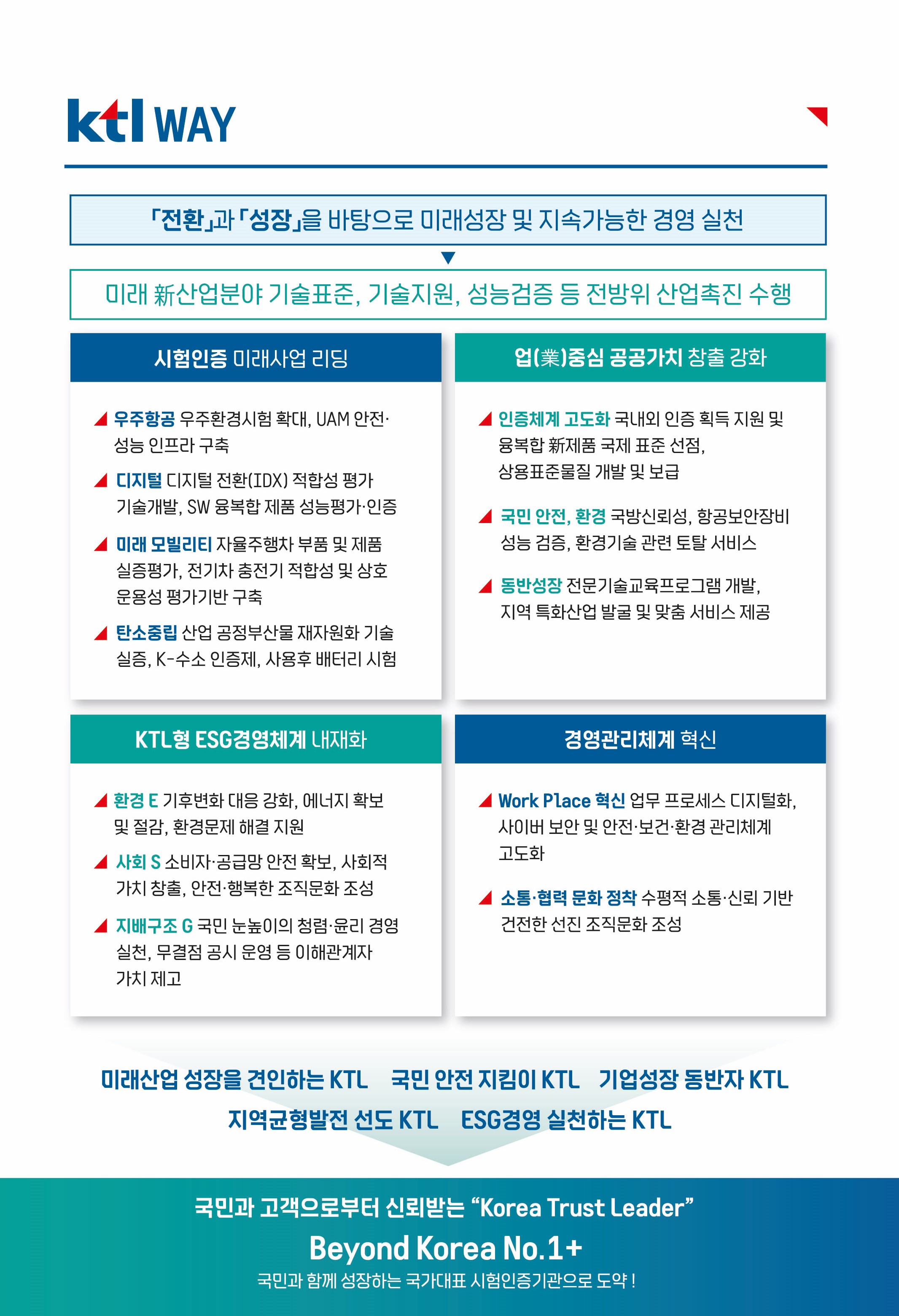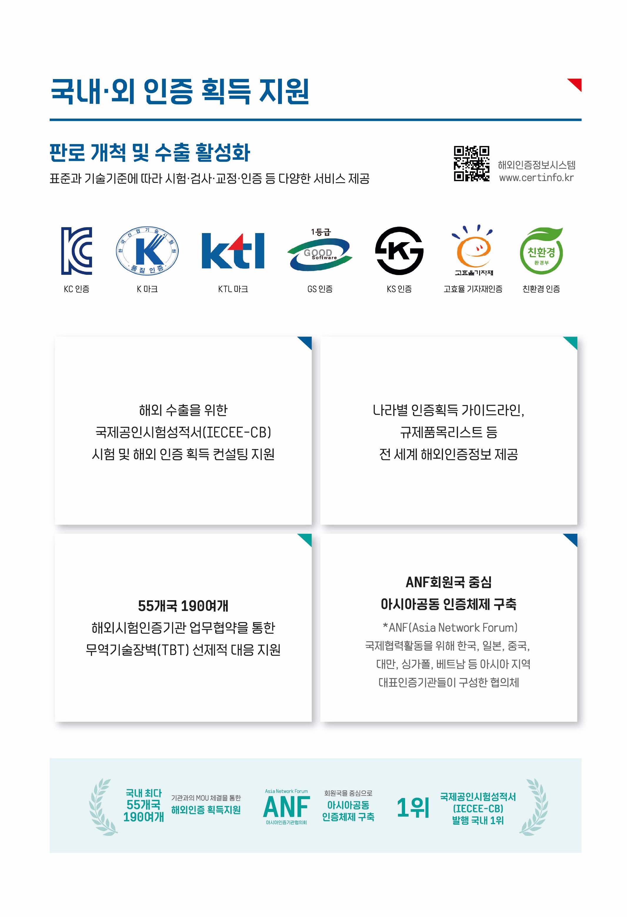 시험인증기관 중 유일한 공공기관으로서, 기업의 연구개발 성과물이 국내외 시장에서 요구하는 성능 및 안전요건을 객관적이고 정확하게 검증합니다. 이를 통해 한국산업기술시험원은 국민안전을 확보하고 기업 경쟁력을 높이는 한편, 정부의 산업혁신·기술표준 정책을 현장에서 실현하고 있습니다.