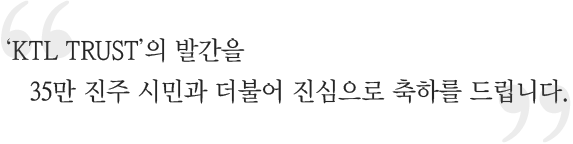 경남 진주 혁신도시로 이전한 한국산업기술시험원에서 본격적인 진주시대를 맞이하여 처음으로 펴내는 웹진 ‘KTL TRUST’의 발간을 35만 진주시민과 더불어 진심으로 축하를 드립니다.