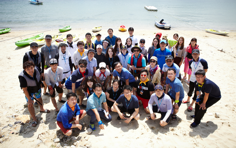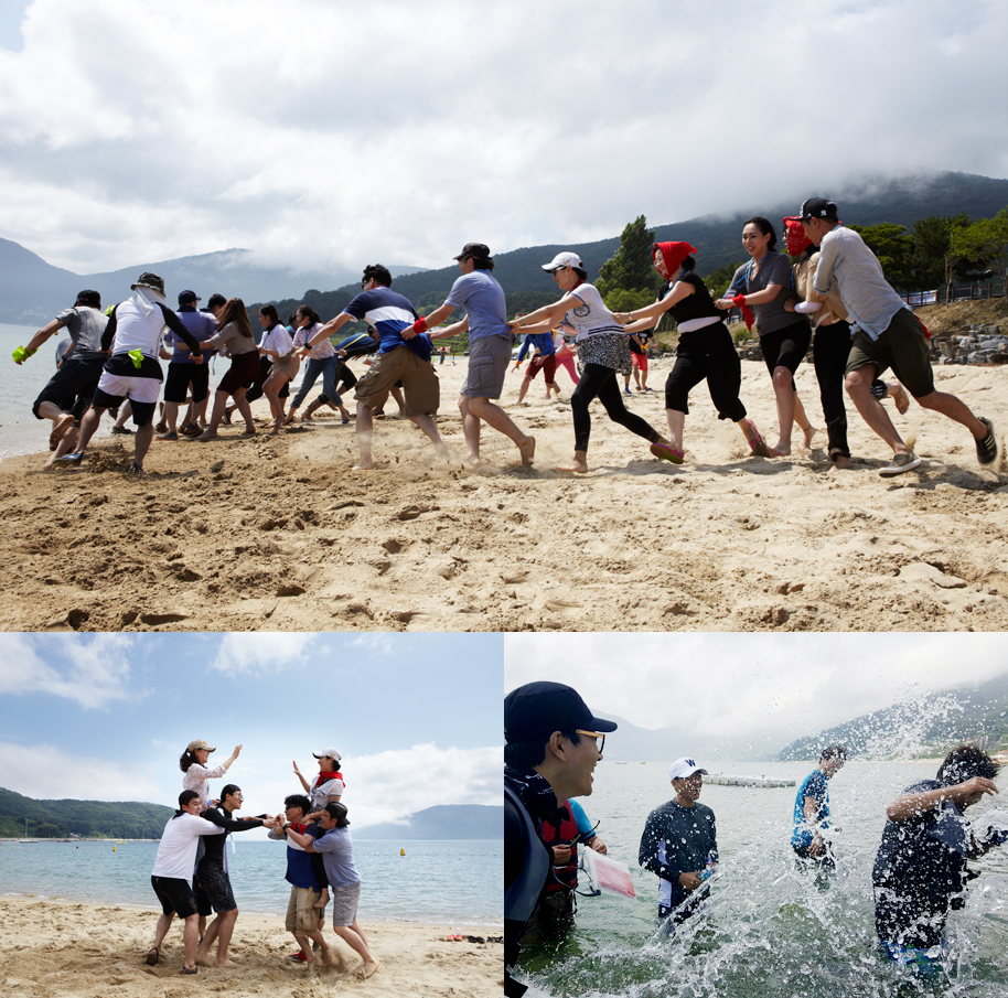 경영정보부에는 네 개의 실이 있다. 이번 전진대회는 각 실의 젊은 직원들이 아이디어를 교류하여 전 코너를 꾸렸다. 때문에 전체적으로 유대관계를 다지는 방식으로 진행된다. “우리는 서로를 거의 일적으로 상대하잖아요. 기껏해야 얼마간에 한 번 회식이 사석에서 보는 전부인데. 밖에서 보니 더욱 의미도 있고. 무엇보다 1박 2일 야외에서 이런 활동을 하며 시간을 보낸다는 게. 그저 관광보다 훨씬 의미 있죠.” 말을 마친 총무자산실장이 바닷물 가득 머금은 피부를 생수로 씻어낸다.