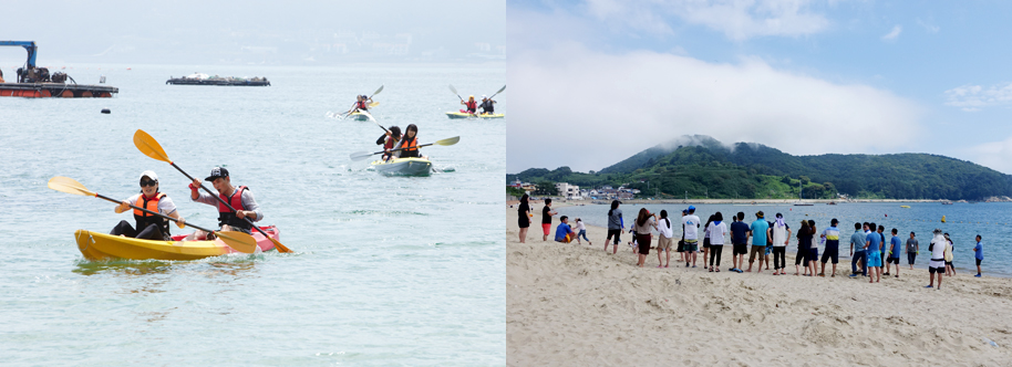 호우전선도 경영지원본부인들의 전진대회를 위해 잠시 자리를 비켜준다. 카약경기가 한창인 구조라 해수욕장에 도착했다. 서로를 격려하고 응원하는 목소리로 물결친다. 앞서 하나의 가치를 사진으로 구현해보는 미션을 함께 수행한 덕일까, 더욱 돈독해진 모습으로 취재팀을 맞이한다. 구름이 산줄기를 따라 바다로 흘러드는 이곳에서 오늘 즐거운 야외활동을 통해 단합의 시간을 가지기로 한다.
