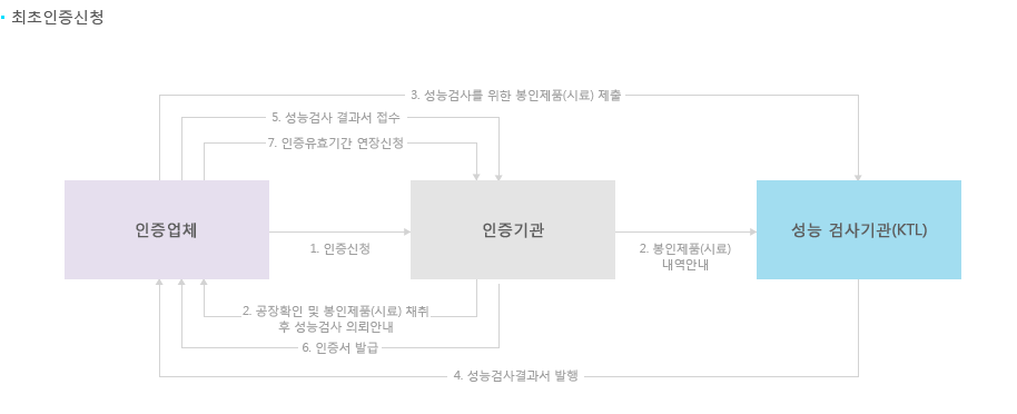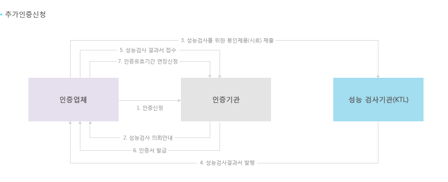 → 5. 성능검사 결과서 접수 → 6. 인증서 발급 → 7. 인증유효기간 연장신청