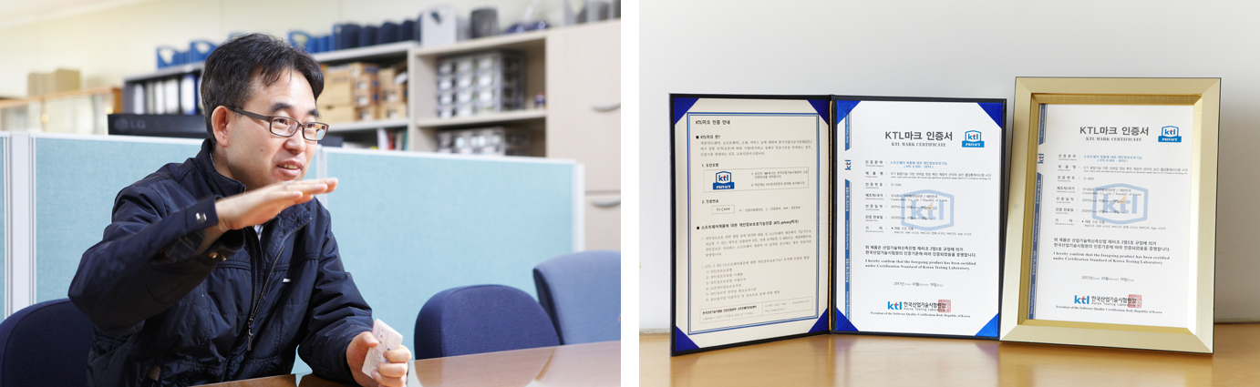 한편 지난 2월 ‘소프트웨어 제품에 대한 개인정보보호 기능’ 분야에서 최초의 KTL 마크 인증서가 발급됐다. 정보통신기술(ICT)기업 크리에이티브넷이 개발한 ‘ICT 융합 기반 출입통제시스템’이 첫 인증의 주인공. KTL 소프트웨어 제품 개인정보보호 기능 인증은 개인정보보호법 6개 법령 중 소프트웨어 제품에서 지원하는 기술 요구 사항과 KTL 자체 기술 규격을 반영해 만들어졌다. 방대한 소프트웨어 분야에서 개인정보보호 분야를 먼저 시작한 이유는 국내외에서 개인정보보호에 대한 수요가 크고 그만큼 파급효과도 강력하기 때문이다. “기존 개인정보보호 인증은 제품이 아니라 조직이 대상이었습니다. 어떤 조직이 법 규정에 부합도록 암호화를 하고 있는지 검증하는 것이죠. 만약 A라는 조직에서 구입한 소프트웨어에 암호화 기능이 없을 경우 다른 제품을 추가로 구입하는 경제적 손실이 발생할 수도 있겠죠. 저희는 이런 취약점을 보완하기 위해 소프트웨어 제품 자체에 대한 인증으로 특화 시킨 겁니다.”