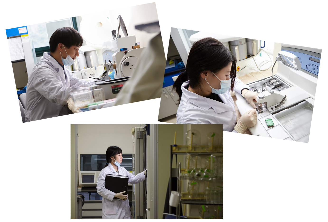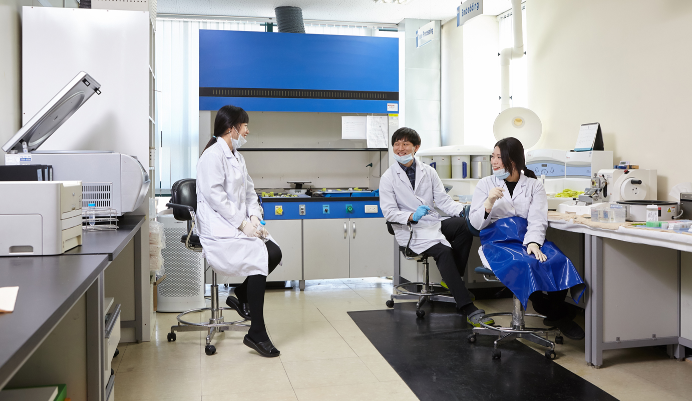 “조직병리를 연습 할 때 장기별 분류 과정에서 잘못된 부분을 절취하는 경우도 많았고… 쉽게 말해 장기가 바뀌는 거죠. 이 장기를 넣어야 하는데 다른 장기를 넣는다거나. 염색하는 과정에서 시약 교환 주기를 놓쳐 현미경 검경과정에서 염색이 선명하게 돼 있지 않았다거나… 이런 시험관리 과정에서 실수 참 많이 했어요. 처음 다루는 기계도 많다보니 조작에 있어서도 미숙했고. 자연히 오작동도 많이 나고, 기존에 맞춰놓은 컨디션을 잘못 입력한다거나… 그럴 때마다 선배님들이 정말 많은 도움을 주셨어요. 제가 스스로 익힐 수 있도록 해주셨고요. 많이 배웠습니다. 앞으로도 배울 것 정말 많은데, 그렇게 이곳에서 잘 성장해 저도 그런 선배가 되고 싶습니다.” 김준섭, 김혜진 연구원의 이야기 끝에 환히 웃어 보이는 김말녀 선임연구원. 그들은 계속해서 눈을 맞추며 대화하고, 웃고, 공감했다.