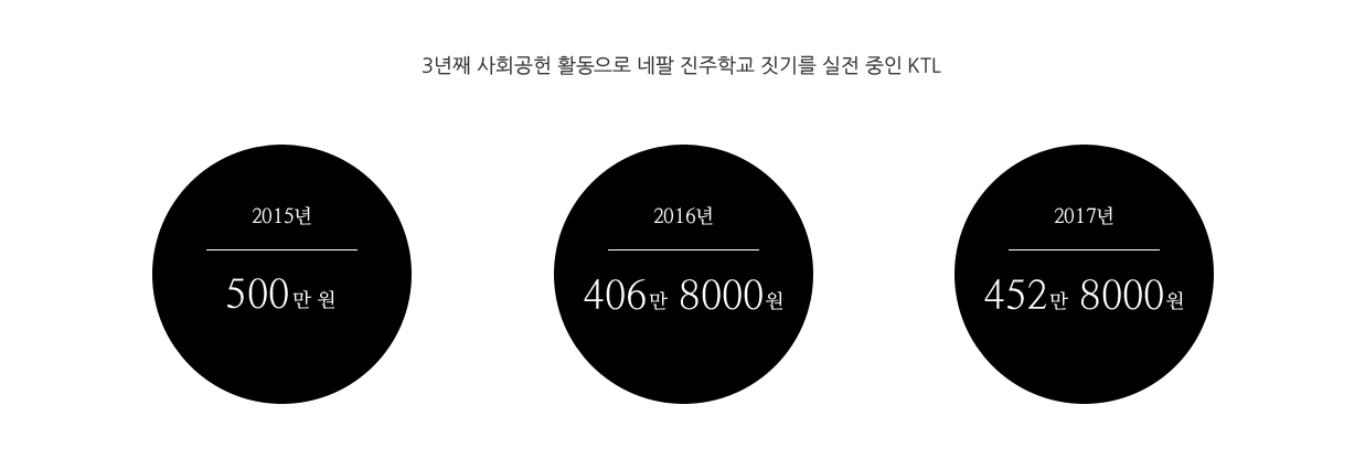 인간은 자연 앞에 한없이 작은 존재가 아니던가. 최악의 대지진으로 인해 고통과 아픔을 겪고 있는 네팔 국민들. KTL 역시 가만히 있을 수만은 없는 노릇! 국내에서는 네팔 국민들을 향한 도움의 손길이 이어지고 있는 가운데, KTL이 ‘네팔 진주학교 짓기 성금’을 전달했다. 사 내 노동조합과 힘을 합쳐 ‘네팔 지진피해 성금 모금운동’을 펼친 것이다. 그렇게 모인 성금을 어떤 방법으로 네팔에 전달하면 좋을지 고민한 끝에 ‘네팔 진주학교 짓기 모임’에 전달키로 결정했다. 뿐만 아니라 성금은 어려움을 겪고 있는 네팔 국민을 위한 구호품 지원과 피해지역 재건사업에도 쓰일 예정이다.