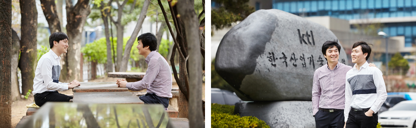 사실 두 사람의 인연은 이재성 연구원이 KTL에 입사하기 직전으로 거슬러 올라간다. 이재성 연구원이 면접을 볼 당시 박형관 책임연구원이 면접관으로 그 현장에 함께했던 것. “이재성 연구원이 워낙에 멋있잖아요. 그런데 스마트하기까지 했으니 당연히 기억에 남았죠. 그런데 그 훤칠하고 수줍음을 타는 모습은 업무시간 이외의 모습이었어요. 업무 중에는 늘 적극적이고 능동적일뿐만 아니라 굉장히 똑똑한 친구라는 느낌을 많이 받고 있습니다. 요즘엔 믿고 맡기는 부분이 점점 많아지고 있어요.”라며 이재성 연구원에 대한 솔직한 생각을 말하는 박형관 책임연구원. 그 말끝에 “처음엔 어렵기만 했지만 항상 일에 대한 사랑과 보람을 느낄 수 있게 이끌어주신 선배님 덕분에 지난 2년 간 잘 적응하며, 회사에 대한 자부심과 애사심을 가질 수 있었습니다.”라며 겸손하게 답하는 이재성 연구원. 서로가 서로를 존중하고 배려할 뿐만 아니라 자신의 일에 대한 결연한 의지를 보여주는 두 사람의 모습은 선후배, 동료의 개념을 넘어 또 다른 가치를 만들어내고 있는 듯하다.