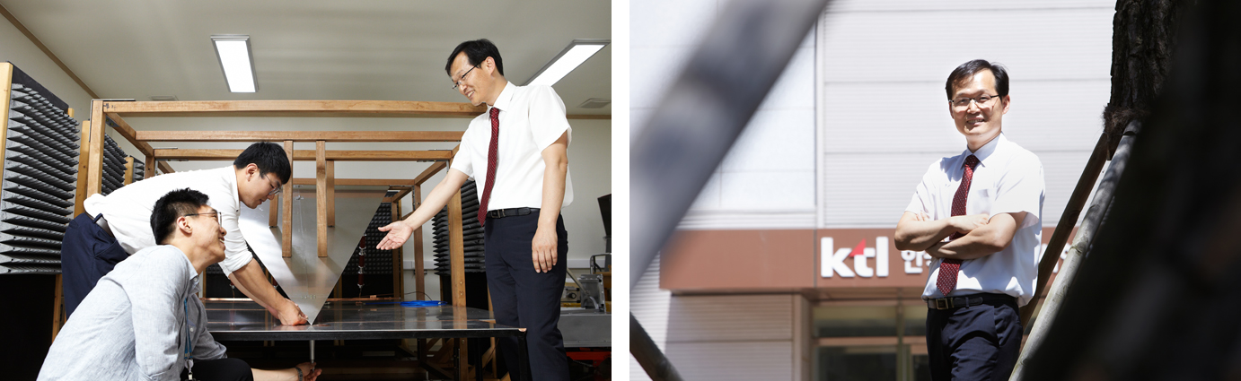 KTL TRUST 독자여러분, 안녕하세요. 저는 경남 진주 항공우주산업도시에 위치한 KTL 본원의 항공전자기기술센터의 센터장을 맡고 있는 장태헌입니다. 우선 이렇게 만나뵙게 되어 진심으로 반갑습니다.^^ 저희 센터는 우주항공산업도시로 비상하고 있는 진주 지역민들의 많은 관심과 도움으로 지난해 10월, KTL 진주 본원에 설립된 신생센터로, 주로 항공관련 시험과 국책 및 수탁과제를 수행하고 있습니다. 시험분야로 국방 및 항공 규격의 전자기 환경 기준에 적합한지를 검증하는 시험을 하고 있으며, 과제 분야로는 KF-X 한국형 전투기의 전자파 낙뢰 차폐효과 해석 과제 등 많은 항공 과제를 수행하고 있습니다. 특히 항공우주 산업도시에 걸맞는 항공기 본체 극한전자기환경 EMC 시험이 가능한 대형 챔버 구축, 인공위성에 쓰이는 우주 부품의 전자기적합성 검증시험을 수행하는 챔버 구축사업 등을 담당하고 있습니다. 이 외에도 HEMP 시험표준 개발 및 각종 차폐 기술에 대한 과제를 수행하고 있습니다.