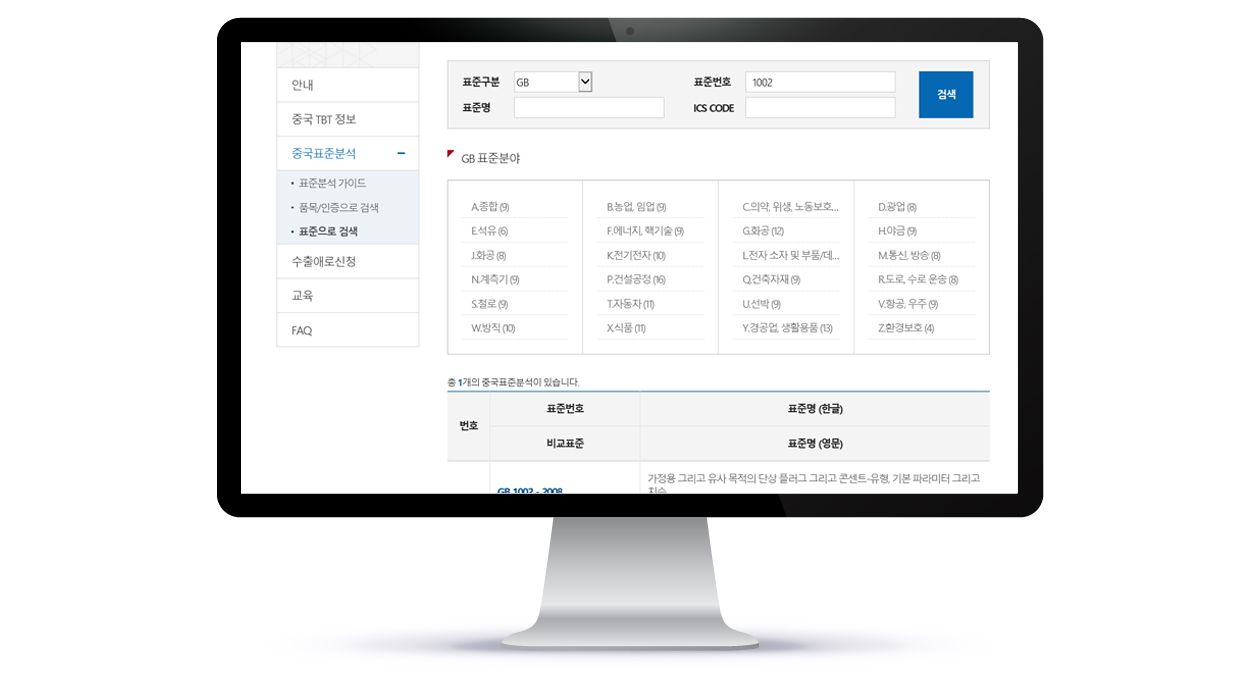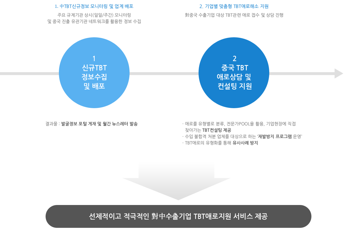 - 표준분석정보와 중국의 신규규제, 기술규제로 인한 피해사례, 인증관련 서식 및 절차 제공 등 TBT정보를 한눈에 확인할 수 있는 중국에 특화된 TBT종합 창구 역할