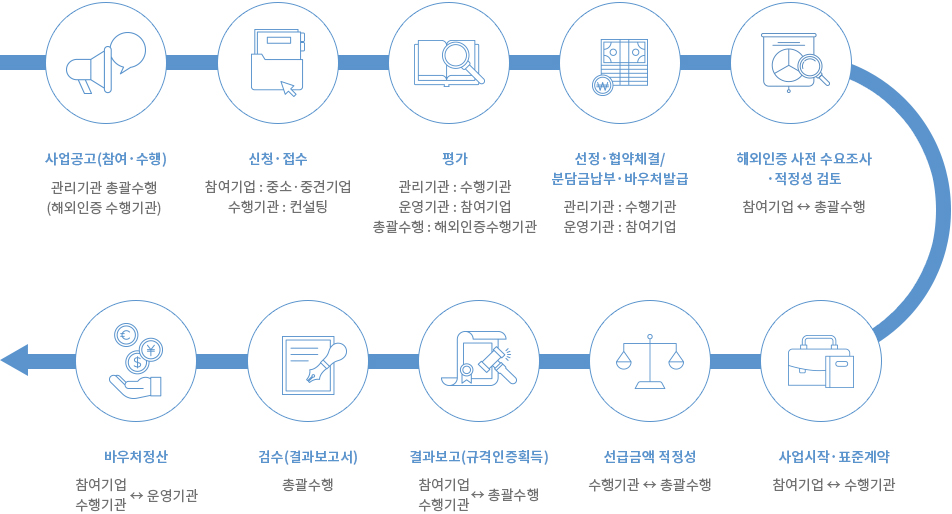 제출한 인증사실 확인 검증과 인증획득비용 검토 후 검수되며, 참여기관과 수행기관의 민원해결도 적극 지원하게 된다.