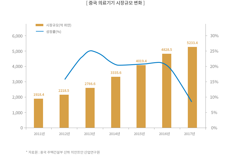 중국 의료기기 시장은 매년 성장추세이며, 2011~2017년 연간 평균 성장률이 18%에 육박할 만큼 빠른 성장세를 보인다. 중국 주택 건설부 산하 치안쯔안 산업연구원에 따르면, 2017년 중국 의료기기 시장규모는 5,233억 4,000만 위안으로 전년 대비 8.38% 성장했다.