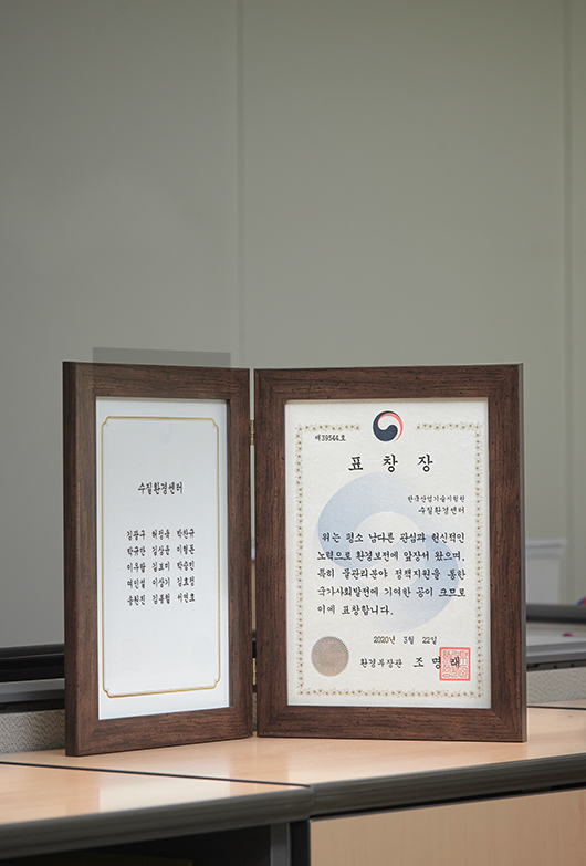 “올해 단체 표창 수상이 현업에 대한 자긍심과 책임감을 또 한 번 느낄 수 있는 뜻깊은 기회가 되었습니다. 현세대의 안전한 국민 삶의 질 향유에 대한 보람은 물론 후세대로의 온전한 대물림에 대한 막중한 책임감을 느낍니다. 앞으로도 국민건강과 자연환경의 보존 및 수질오염 예방을 위한 기술 지원 역할은 물론 수질오염 방지를 위한 최일선 감시자의 역할을 꿋꿋이 담당해나가겠습니다.”