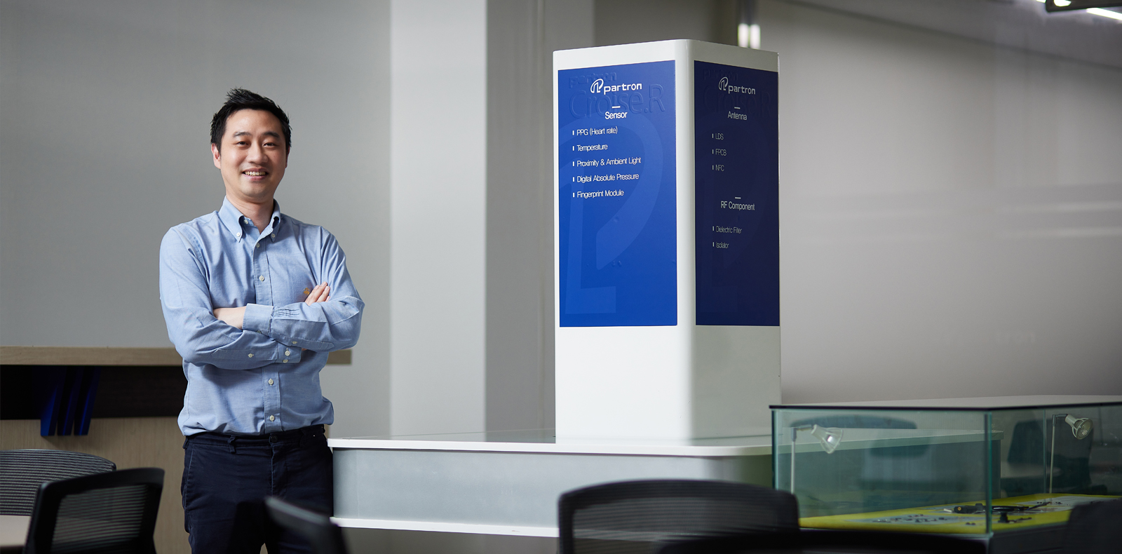 “저희 ㈜파트론은 지금까지 축적한 고도의 반도체 조립기술을 활용해 다양한 제품 개발에 힘써 왔습니다. 그 결과 심장박동 센서, 온도 센서, 압력 센서, 근접 및 조도 센서, 마이크, 이 외에도 와이파이(WiFi), 블루투스(Bluetooth) 등의 RF 모듈과 수정 디바이스, 진동 모터, 유전체 필터 및 아이솔레이터 등을 생산하는 종합 부품회사로서 개발 능력과 품질을 모두 인정받고 있습니다.”