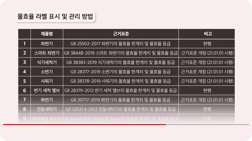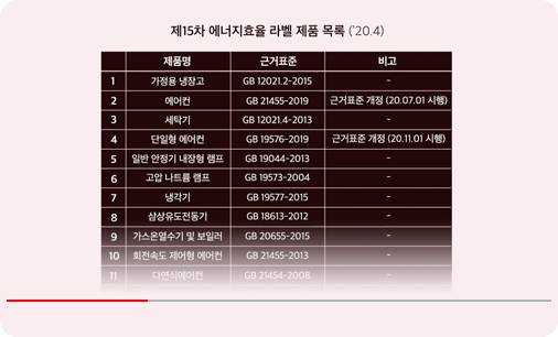에너지 효율 라벨 등급 표시를 위한 기준치는 제품별로 다르다. 이 기준치는 각 제품별 라벨링 실시 규칙 안에 명시된 국가 표준을 기준으로 시험을 진행하고 있다.