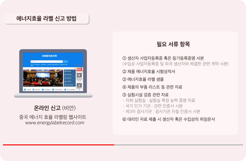 대상 제품 여부 확인 후 정해진 시험소에서 시험을 진행한다. 검사 후 해당 효율 라벨을 제작해 에너지 라벨 웹사이트에 제품 시험 결과를 포함한 각종 자료를 첨부하여 신고하면 된다. 제품 또는 제품 포장 상자에 라벨 부착 후 중국으로 제품 출하 및 수출할 수 있다.