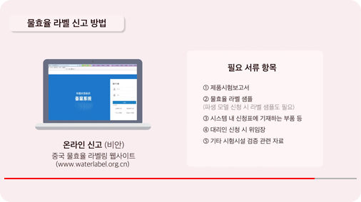 대상 여부 확인한 후 GB시험을 진행하고 중국 물 효율 라벨링 웹사이트에 기업 회원 가입 후 제품 B1시스템 내 모델별 퓨어 코드를 신청한다. 라벨을 제작하고 다시 중국 물 효율 라벨링 웹사이트에 필수 자료를 업로드한다. 자료 심사 통과 후 제품 또는 제품 포장 상자에 라벨을 부착해주면 중국으로 수출 가능.