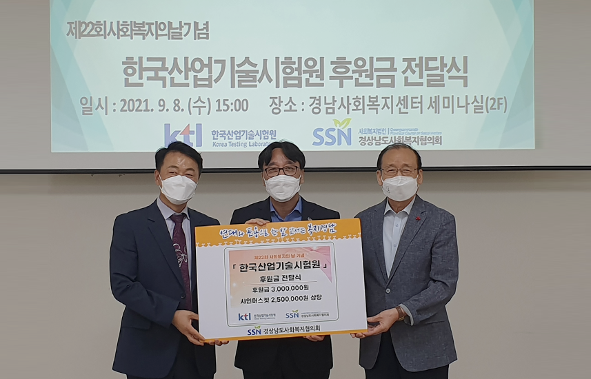 국내 유일 공공 종합시험인증기관인 한국산업기술시험원(이하 KTL, 원장 김세종)은 지역 취약계층의 복지증진을 위해 후원금(3백만원)과 포도 100여* 상자를 경남사회복지협의회(이하 협의회, 회장 박성욱)에 전달했다고 9월 9일(목) 밝혔다.