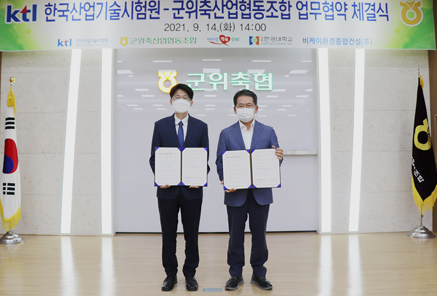 국내 유일 공공 종합시험인증기관 한국산업기술시험원(이하 KTL, 원장 김세종)은 군위축산업협동조합(이하 군위축협, 조합장 김진열)과「가축분뇨 고체연료*화 실증연구를 위한 업무협약」을 체결했다고 9월 15일(수) 밝혔다.