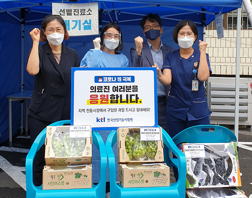 KTL 임직원은 지난해에 이어 올해도 선별진료소 의료진들의 노고에 보답하기 위해 진주시보건소, 경상국립대병원, 진주고려병원 등 진주시 선별진료소 8곳에 직접 방문하여 포도 80여 박스와 응원의 메시지를 전달하였다.