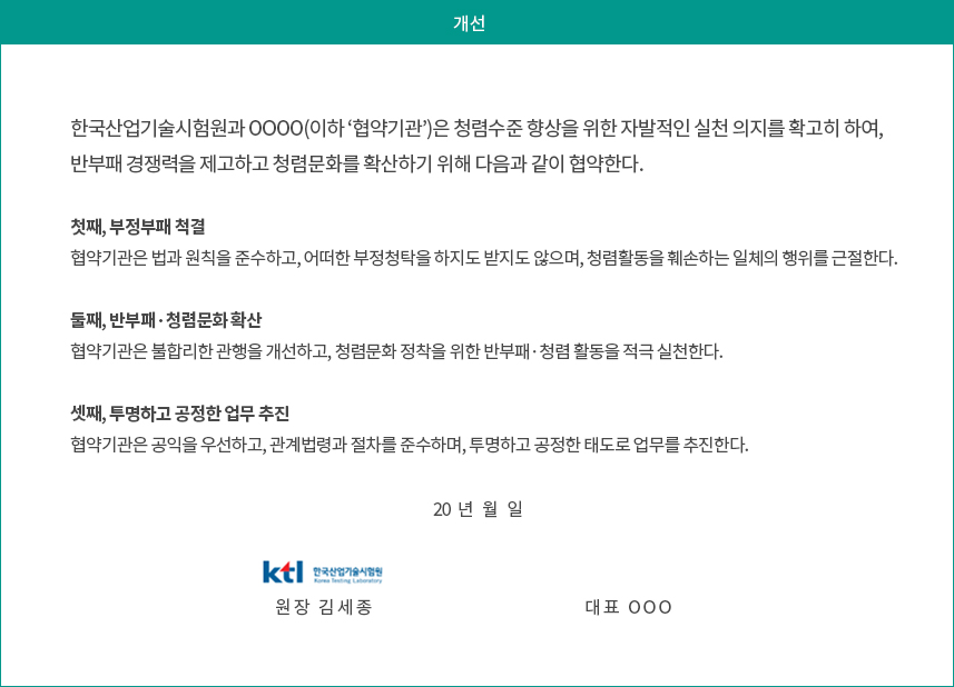 한편, KTL은 청렴경영 4-Free를 이행하여 튼튼한 청렴 생태계를 조성하는 등 국민 눈높이에 맞는 투명·청렴·윤리경영 추진을 위해 노력하고 있다.