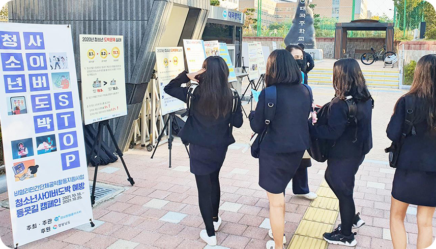 이번 캠페인은 ‘코로나 OUT! 청소년 사이버 도박은 STOP!!’ 슬로건과 함께 등교 시간에 실시했으며, 인터넷과 스마트폰 보급으로 사이버 도박 노출 위험이 높은 청소년들에게 사이버 도박의 위험성을 알리는 등 사이버 도박 예방을 위한 시간을 가졌다.