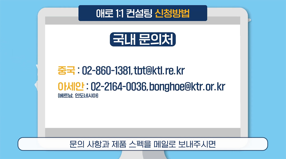 수출 기업 맞춤형 TBT 애로사항을 상시 접수하고, 1:1 상담을 위한 전담 창구를 운영하고 있다. 시험인증 대상 여부 및 획득 지원 컨설팅, 표준 정보 컨설팅, 통관 절차 및 리콜 관련 컨설팅, 신규 기술규제 대응 컨설팅 등 폭넓은 지원이 가능하다. 문의 사항과 제품 스펙을 메일로 보내면 수출 국가와 제품에 맞는 맞춤형 컨설팅이 가능하며, 해외에도 현지 TBT 상담실을 운영 중이다.