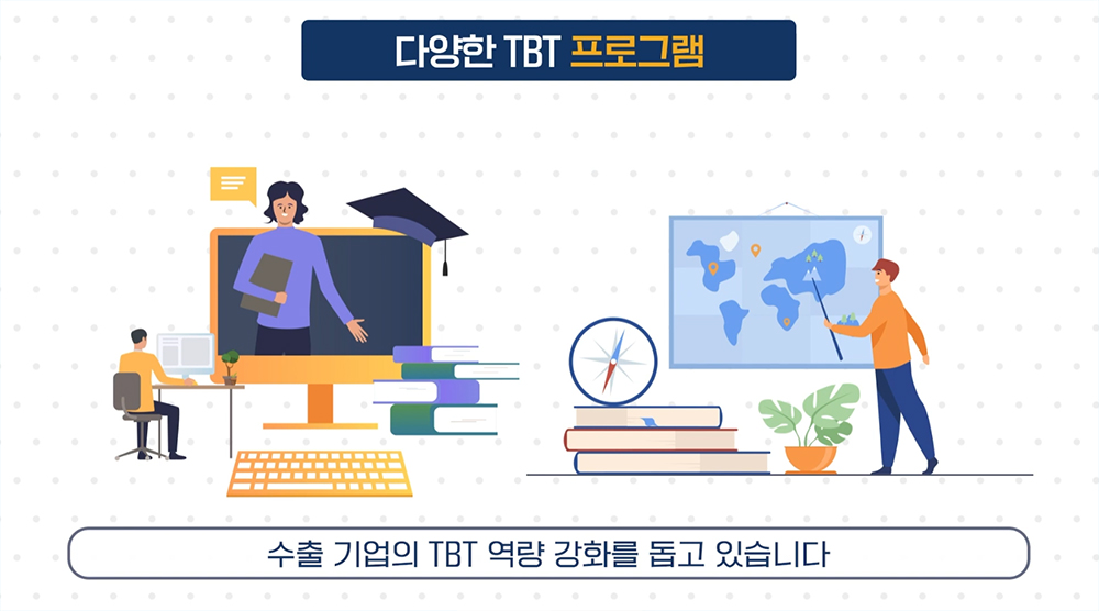 수출 기업의 TBT 역량 강화를 위해 온·오프라인 맞춤형 TBT 교육을 진행하고 있다. 중국, 신남방 국가의 강제성 인증제도와 라벨링 등 수출 기업이 반드시 알아야 하는 해외 기술규제에 대해 분야별 전문가를 섭외해 프로그램을 진행하며 산업용 로봇, K방역제품 등 신산업규제 정보와 신남방 주요국의 TBT 소식도 제공하고 있다. 또 교육 현장에서는 TBT 전문가를 통한 컨설팅도 함께 진행하고 있다.