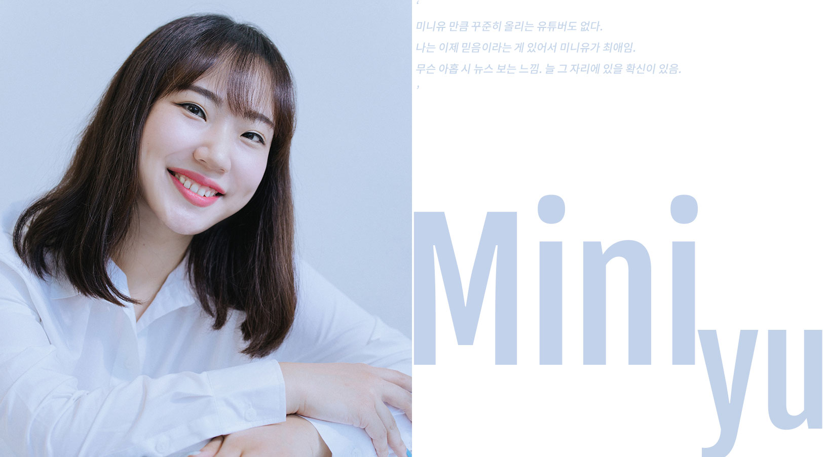 ASMR 유튜버라는 자부심을 가져 더욱 발전하는 모습을 보이고 싶다는 미니유. 그녀가 만드는 콘텐츠가 언제나 같은 자리에서 기다리는 진심 어린 휴식처로, 때론 촉촉한 위로가 되어 구독자들의 마음에 닿을 수 있길 응원한다.