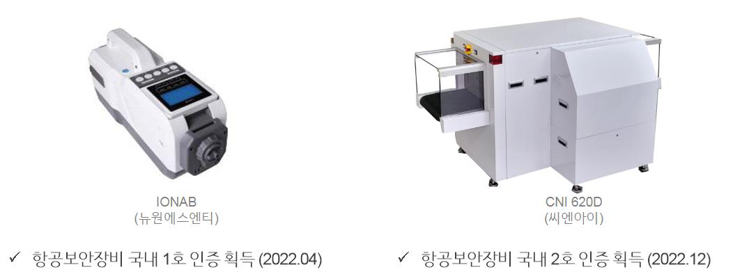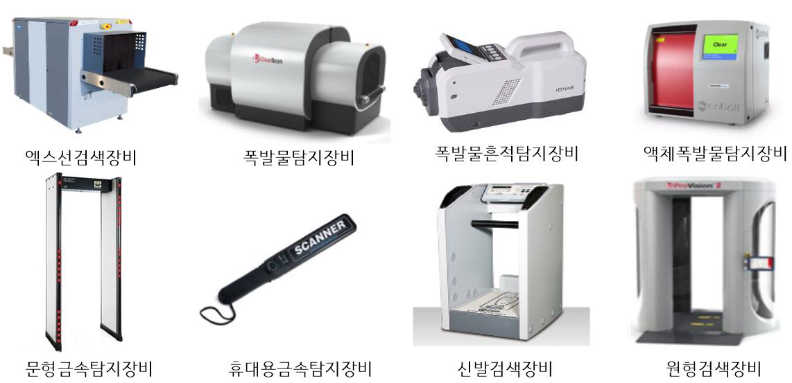 | 보안검색장비 인증 대상 8종 장비 | 엑스선검색장비/폭발물탐지장비/폭발물흔적탐지장비/액체폭발물탐지장비/문형금속탐지장비/휴대용금속탐지장비/신발검색장비/원형검색장비 | |