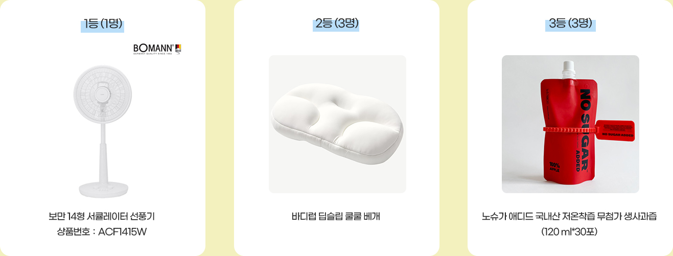 퀴즈 이벤트에 참여하고 여름을 상쾌하게 만들어 줄 선물 받아 보세요 한국산업기술시험원 웹진 <KTL TRUST>에서 준비한 퀴즈 이벤트입니다. 퀴즈에 참여해 주신 분들을 추첨하여, 보만 14형 서큘레이터 선풍기, 바디럽 딥슬립 쿨쿨 베개, 노슈가 애디드 국내산 저온착즙 무첨가 생사과즙을 드립니다. 이벤트 선물 이벤트 기간 2023. 6. 5. - 2023. 6. 12. (자정까지) 당첨자 발표 2023. 6. 14. (KTL 홈페이지→알림마당→이벤트 코너에서 확인 부탁드립니다.)