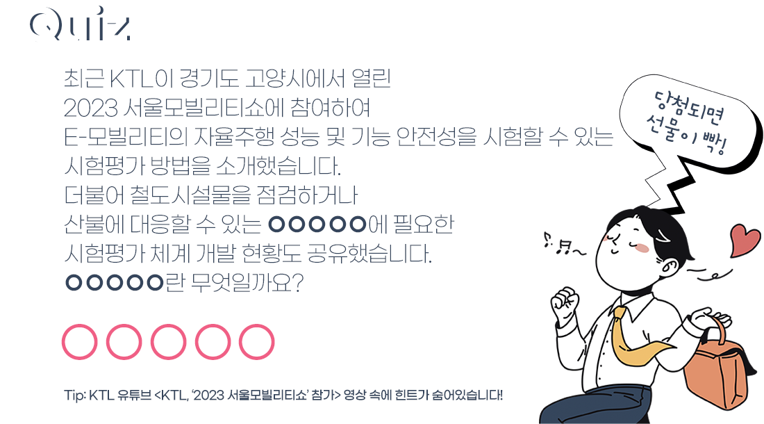 힌트 보러가기 정답 입력하기 이벤트 참여 시 유의사항 · 당첨자 발표는 KTL 홈페이지를 통해 안내합니다. · 경품 이미지는 실물과 다를 수 있으며, 주관사 사정으로 이벤트 내용 및 경품이 변경될 수 있습니다. · 또한 경품의 디자인 및 색상이 여러 개일 경우 랜덤으로 발송됩니다. · 5만원 이상 경품의 경우 제세공과금 22%는 당첨자가 부담해야 합니다. 만약 제세공과금 부담에 따른 절차를 진행하지 않을 경우, 당첨이 취소될 수 있습니다. · 수집된 개인 정보는 당첨자 선정 및 경품 발송을 위해 사용되며, 경품 발송 후 모든 개인 정보는 폐기됩니다.