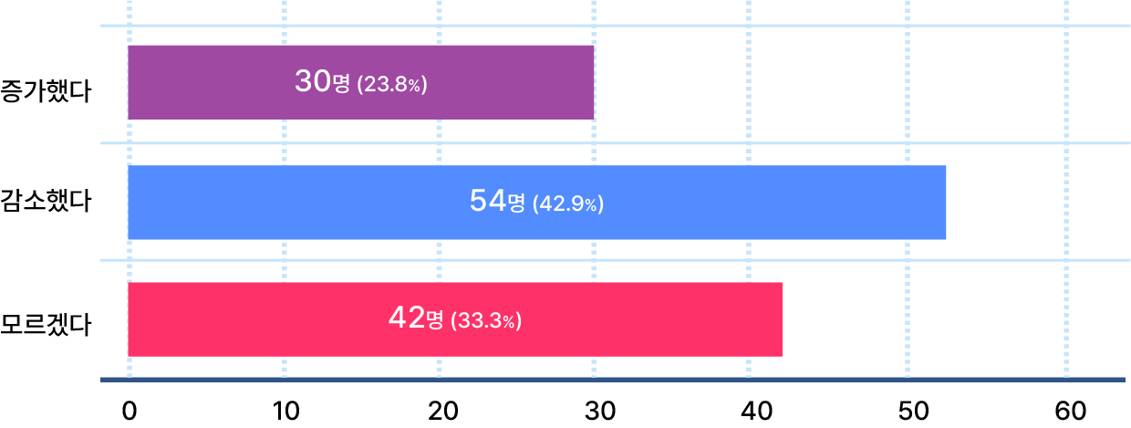 입사 이후 창의력 수준에 대해서는 ‘감소했다’는 의견이 가장 많았으며, ‘모르겠다’는 부정적 답변을 포함하면 76.2%가 현재 창의력 수준이 입사 전에 비해 좋아지지 않았다고 생각하고 있었다. 이는 개인적인 측면이나 직무환경 등이 여러 가지 요인이 작용한 결과일 수 있으나 보다 창의력을 증가시킬 수 있는 동력이 필요함을 알 수 있는 대목이다.
