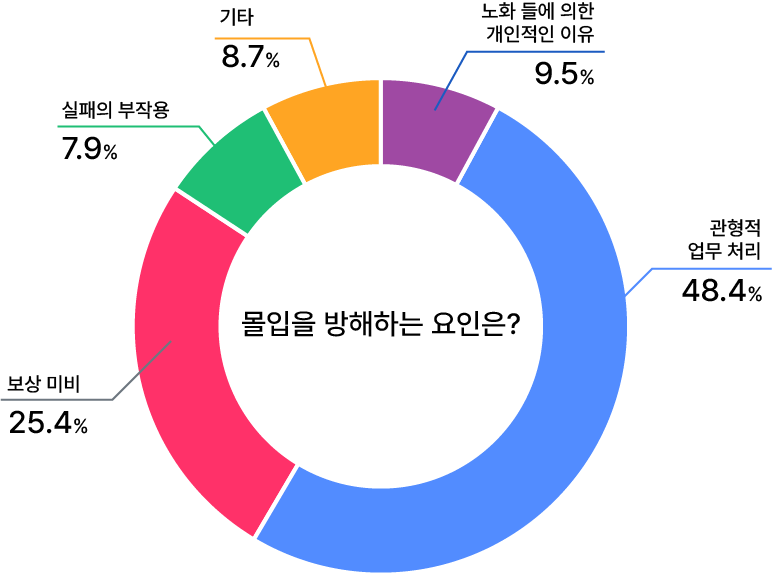 인적자원 관리 차원에서 직원들이 도전적 시도, 창의적 발상을 할 수 있는 장치와 문화를 마련하는 것이 필요해보인다. 창의력이 발현되기 위해서는 몰입이 가장 중요한데, 이 몰입을 방해하는 요소로 ‘관형적 업무 처리’와 ‘보상 미비’의 응답 비율이 높게 나타났기 때문이다. 개방적인 사내문화 분위기가 형성된다면 보다 창의적인 아이디어가 많이 생성되지 않을까?