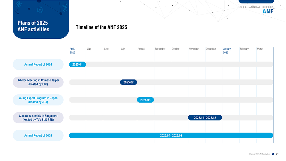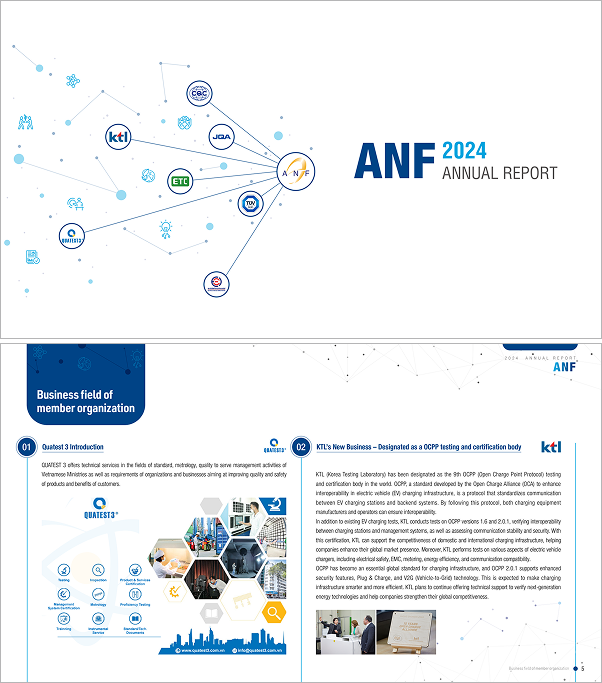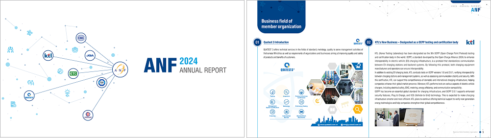 2023년 Annual Report의 경우 ANF 설립 이래 처음으로 발간한 연간 보고서로, ANF 주요 활동을 포함한 다양한 내용을 담아 각 기관의 고객 등 이해관계자들에게 정보를 제공하고 적극적으로 소통하는 도구로 활용되었다. 특히 ▲전기차 충전기를 포함한 각국의 기술 기준 변화 및 적용 기준 ▲탄소중립 방안 ▲ANF 회원 국가별 기술규제(전기안전, 환경ㆍ에너지, 전자파 등) ▲주요 제도의 변경사항 ▲글로벌 무역기술장벽에 대한 의견 교류 내용 등을 수록하며 이해관계자들에 실질적인 도움을 줄 수 있는 정보를 담아 좋은 반응을 얻었다. 그렇다면 2024년 Annual Report의 핵심 내용은 어떤 것들이 담겼을까?