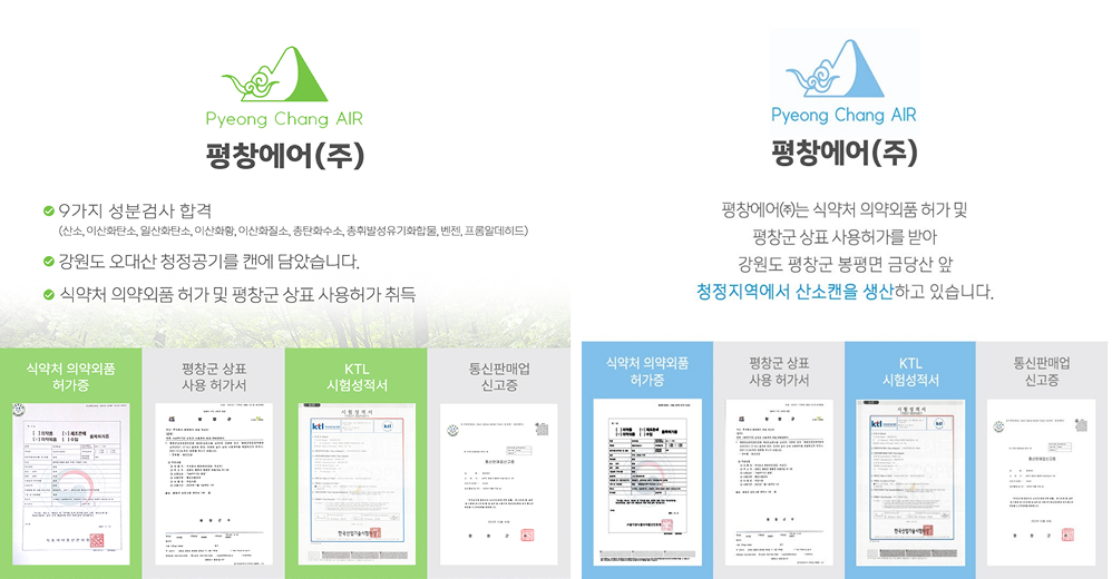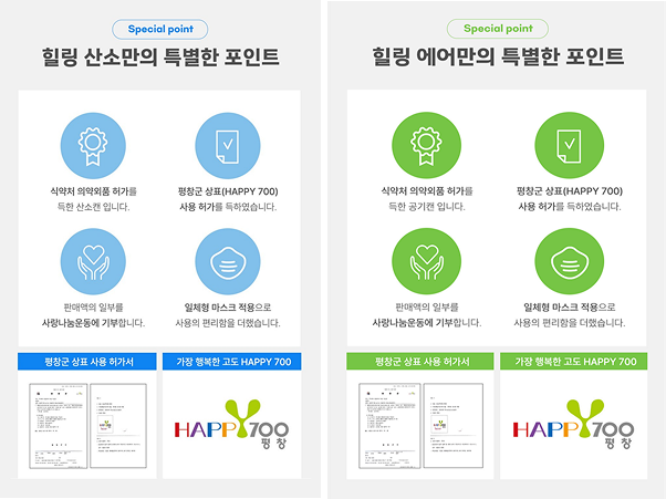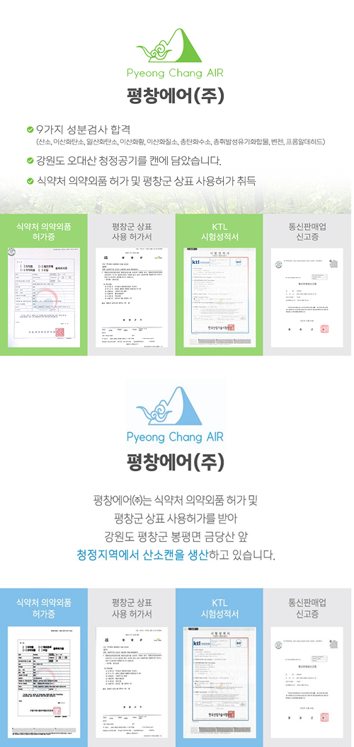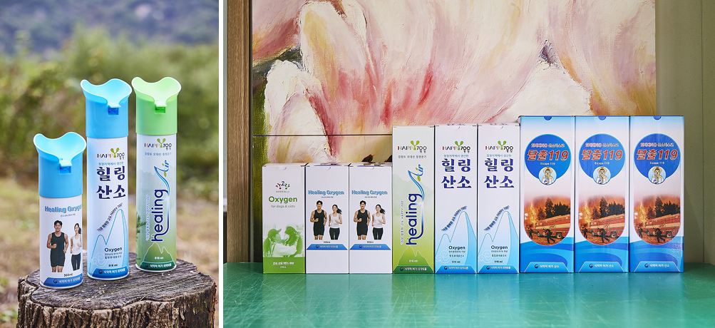 특히 평창군 오대산 깊숙한 곳에서 추출한 공기로 제작된 ‘힐링에어캔’은 산소, 이산화탄소, 일산화탄소, 이산화황, 이산화질소, 총탄화수소, 총휘발성유기화학물, 벤젠, 프롬알데히드 등 9가지 성분 검사를 획득해, 만성질환이나 중증질환을 겪고 있는 환자가 일상생활에서 치료의 도움을 받을 수 있는 제품이기도 하다.
